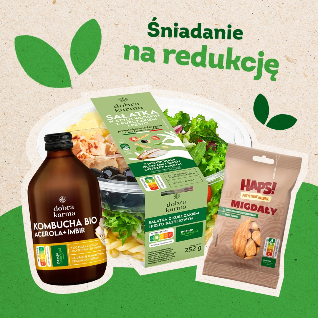 • Sałatka w stylu włoskim z kurczakiem i pesto Dobra Karma • Kombucha bio acerola + imbir • Haps! Migdały