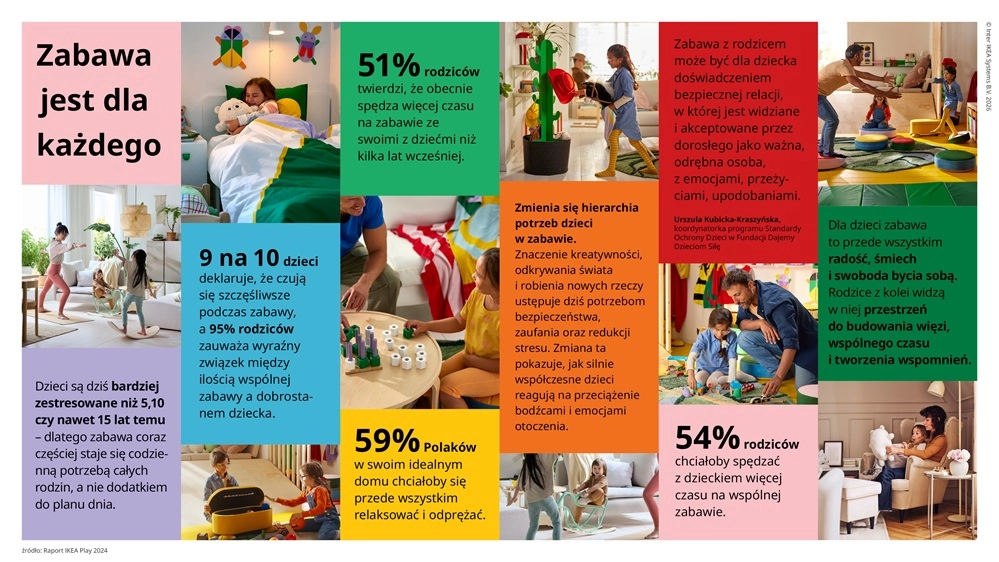 Z danych przywołanych w raporcie IKEA Play 2024 wynika, że 9 na 10 dzieci czuje się szczęśliwszych podczas zabawy, a 95 proc. rodziców dostrzega bezpośredni związek między zabawą a dobrostanem dziecka. Jednocześnie aż 54 proc. opiekunów deklaruje, że chciałoby spędzać z dziećmi więcej czasu na wspólnej zabawie, mimo że ponad połowa robi to częściej niż jeszcze kilka lat temu.