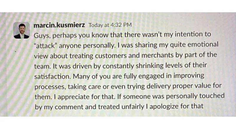 Oto tłumaczenie wyjaśnień prezesa Michała Kuśmierza: „Słuchajcie, być może wiecie, że nie miałem zamiaru „atakować” nikogo osobiście. Dzieliłem się dość emocjonalną opinią na temat traktowania klientów i sprzedawców przez część zespołu. Wynikało to z ciągle malejącego poziomu ich satysfakcji. Wielu z was jest w pełni zaangażowanych w usprawnianie procesów, dbanie o nich czy nawet próby dostarczania im właściwej wartości. Doceniam to. Jeśli ktoś poczuł się osobiście dotknięty moim komentarzem i potraktowany niesprawiedliwie – przepraszam".