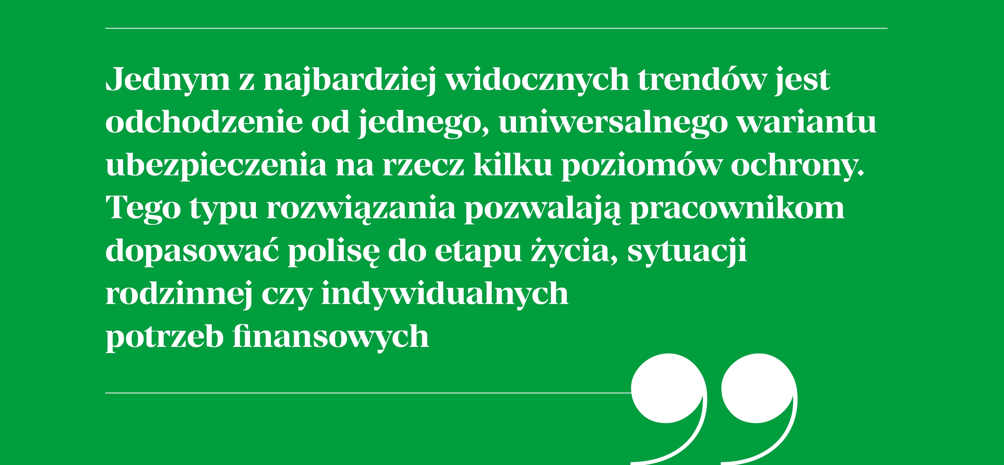 Jednym z najbardziej widocznych trendów jest odchodzenie od jednego, uniwersalnego wariantu ubezpieczenia na rzecz kilku poziomów ochrony. Tego typu rozwiązania pozwalają pracownikom dopasować polisę do etapu życia, sytuacji rodzinnej czy indywidualnych potrzeb finansowych. W organizacjach o zróżnicowanej strukturze zatrudnienia obejmującej zarówno młodszych pracowników, jak i osoby z wieloletnim stażem. Oni mają różne potrzeby, a ubezpieczenie powinno być tak skonstruowane, żeby wychodzić im naprzeciw.