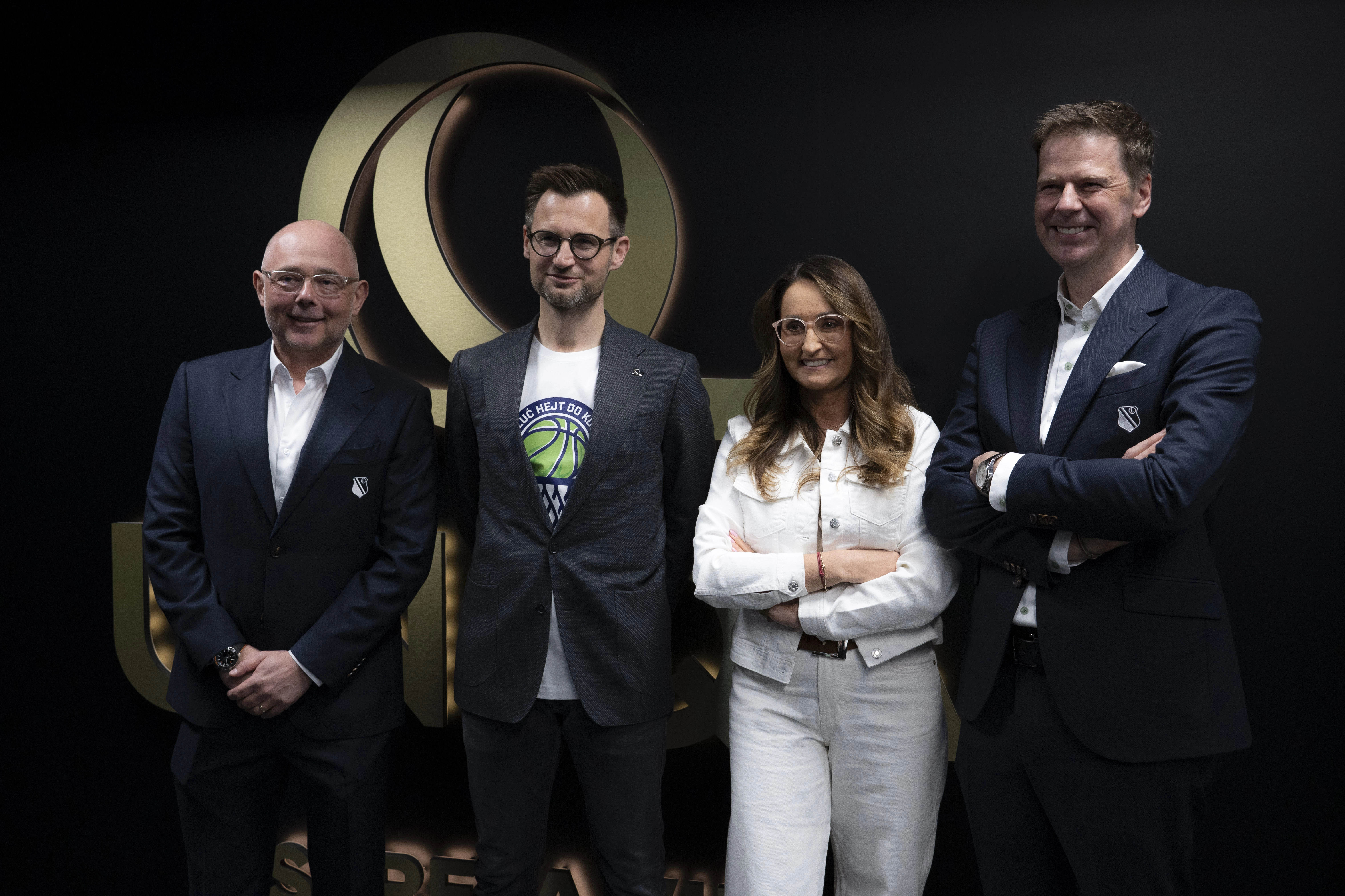Na zdjęciu od lewej Jarosław Jankowski, przewodniczący RN Legii Kosz i współwłaściciel klubu, Marcin Nedwidek, prezes zarządu UNIQA Polska, Renata Kaznowska, wiceprezydent Warszawy i Łukasz Sekuła wiceprezes Legii Kosz