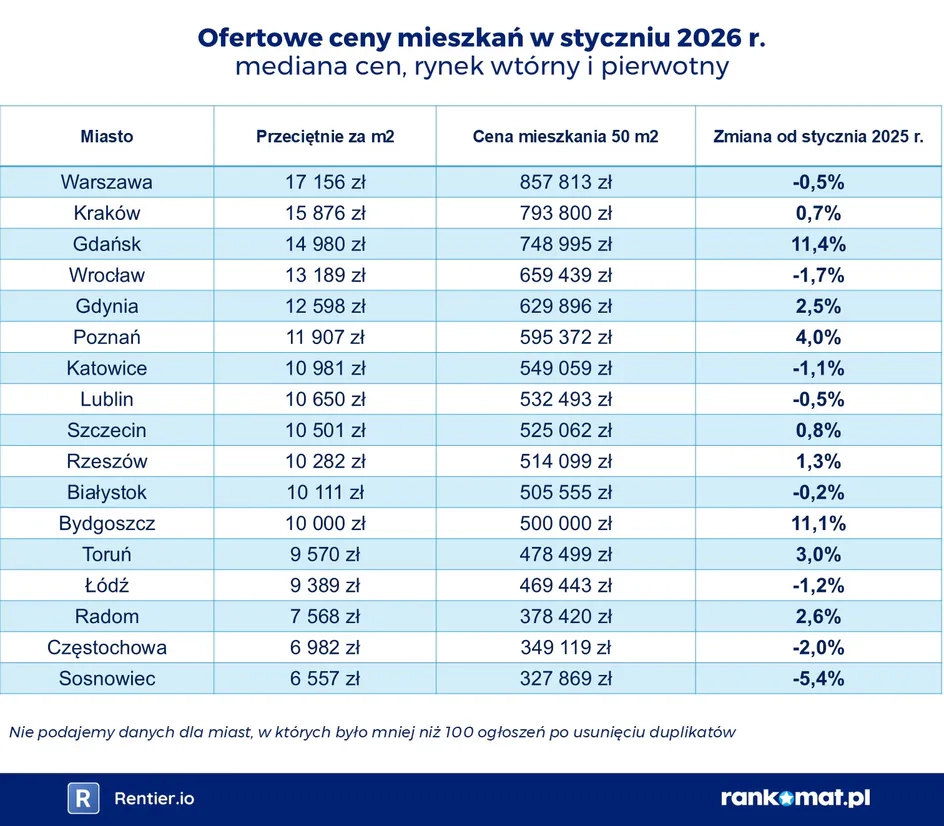 Największą korektę cen zanotował Sosnowiec, gdzie średnia cena metra kwadratowego spadła o 5,4 proc. Spadki pojawiły się także we Wrocławiu (–1,7 proc.) oraz w Warszawie (–0,5 proc.). Odmienna sytuacja panuje w Gdańsku, gdzie ceny wzrosły aż o 11,4 proc.